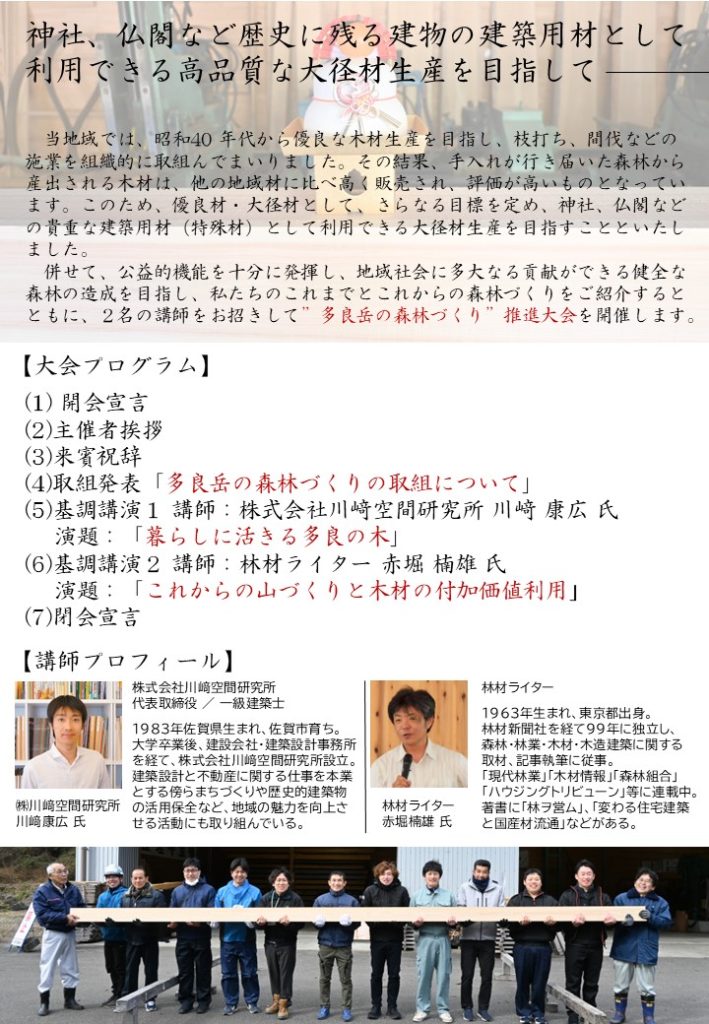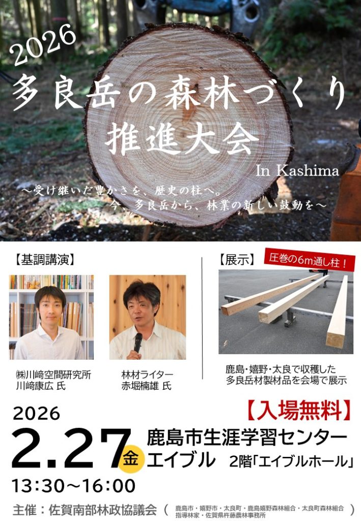 多良岳の森づくり推進大会の開催 2026 2/06 お知らせ 2026年2月6日 多良岳材を使った記念品も準備しています! ご都合つかれる方は誰でも参加できますので是非お越しください! お知らせ URLをコピーしました!